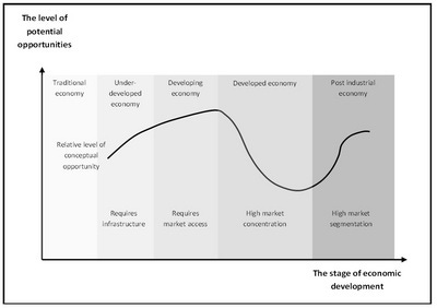 However, even given all the above it is likely that the environment for potential opportunities will increase in the post industrial environment due to large urban diversity, high incomes, and sophisticated market segmentation that has evolved over decades. For example, high market segmentation presents new opportunities that established channels of distribution do not cater for and new distribution channels can be created to exploit these opportunities. New alternative channels appealing to particular segment groups like buy local, organic, Halal, Kosher, Fairtrade create many new product and retail opportunities. Internet retailing is on a massive growth path and the discount shop46 phenomenon throughout Europe, Japan, the United States and Australia is now a very significant worldwide industry. In a post industrial economy it will take more investigation to see potential opportunities as small niches are harder to see than the general environment. Figure 5 shows conceptually the level of potential opportunities in relation to the stage of economic development.