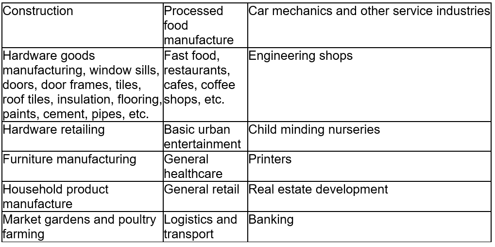 Although economic growth is destroying traditional culture and values, a whole range of new opportunities begin to emerge with rural based urban centres developing. These new towns commercially serve their respective hinterlands with goods, basic education and health services provided by government. Newly developed infrastructure, roads, railways, communications, schools, and health centres help provide the ability of rural society to transform itself. This brings a whole new range of opportunities to those that can see the opportunity, have the resources, networks and skills to develop them. The economy is now developed into partitioned agricultural, manufacturing and service industries with many new opportunities continually developing (Table 2).