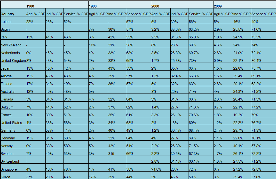 A fully developed economy will eventually drift into becoming a post industrial economy when the major source of employment and income for the nation is the service sector. The agricultural and industrial sectors over decades have slowly lost competitiveness where the manufacturing base has narrowed and importance to national GDP declined drastically (see table 5.). The primary type of industries that remain within a post industrial economy are those that;