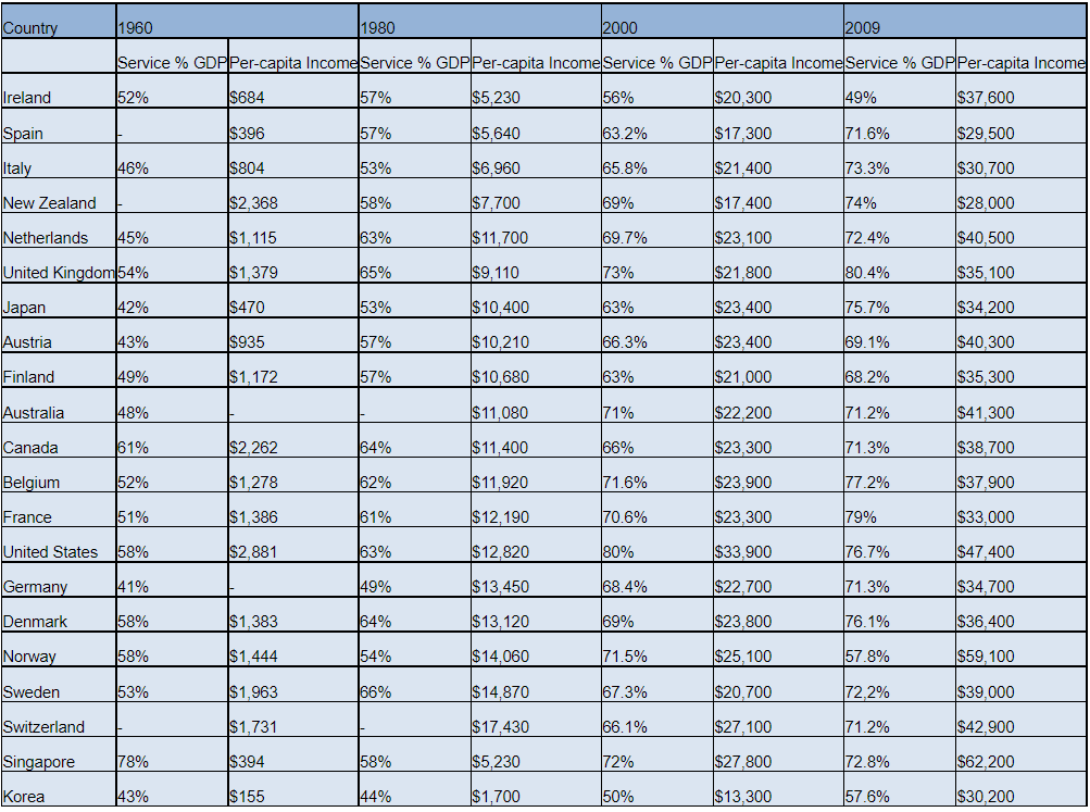 One of the most pronounced changes in the economy during this stage is the rapid rise of the services sector. There has always been traditional services and services linked to the resource, agricultural, and manufacturing sectors, but during the developed stage a dramatic rise in leisure, lifestyle, and high mass consumption services with a high income elasticity of demand occurs.38 The growth progression of the service sector size and per-capita incomes of some selected countries is shown in Table 4 below.
