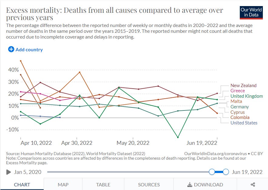 As an example, according to Our World in Data excess mortality for the week ending June 19 in New Zealand was 205 above the average for the same time between 2015-2019, before the pandemic. This is not just exclusive to New Zealand, where the United Kingdom was 15% above the average, in Germany 12%. In early weeks the excess averages were even higher in many countries.