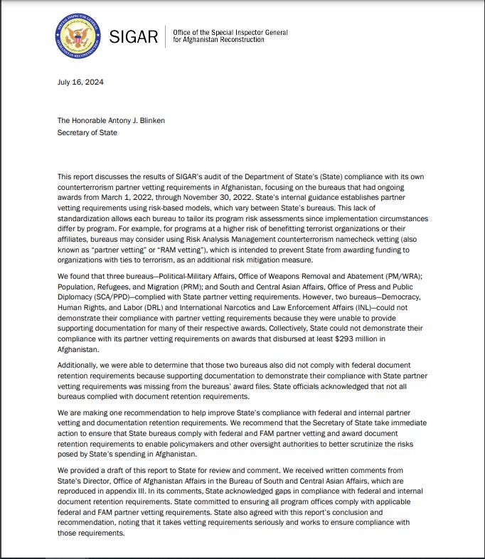 An audit report just released by the Special Inspector General for Afghanistan Reconstruction (SIGAR) found that 2 out of 5 state bureaus running projects in Afghanistan could not demonstration compliance with state partner vetting procedures. In the SIGAR 24-31 Audit Report stated that “Two bureaus, the Bureau of Democracy, Human Rights, and Labor (DRL) and the Bureau of International Narcotics and Law Enforcement Affairs (INL), provided some documentation but not enough to determine whether all their Afghanistan programs complied with State’s vetting guidance.”