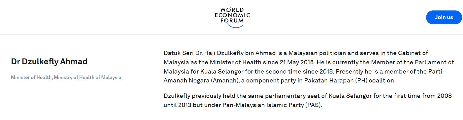 Health minister Dzulkefly Ahmand is an active member of the World Economic Forum (WEF), which is staunchly pro-vaccine and pro-Big Pharma. This is a grave conflict of interest, that led to vaccine disasters across the world, which is being experienced in high excess death rates today, three years after Covid vaccines were rolled out.