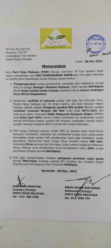 Abdul Razak Ismail, the secretary-general of the Green Party of Malaysia asked why MB Amirudin Shari awarded the contracts for the Selangor Stadium Redevelopment and Selangor Maritime Gateway without proper transparency.